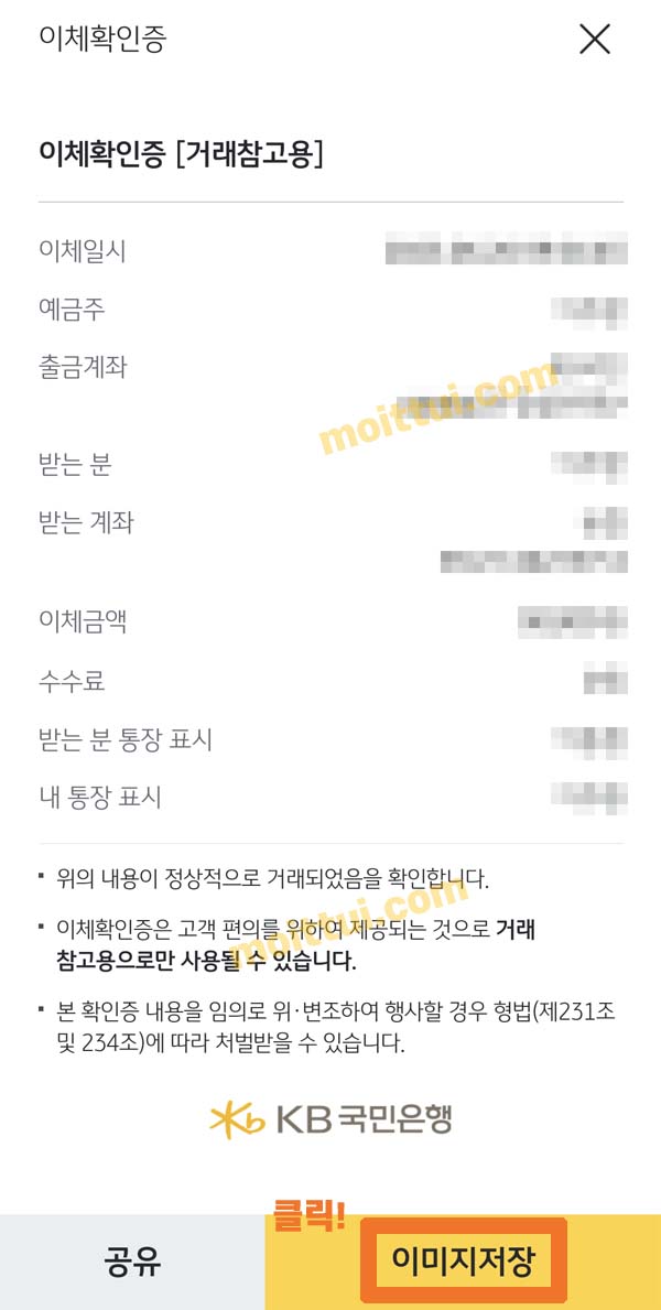 기관이나 회사나 어떤 곳에 국민은행 이체확인증을 제출해야 한다면 위와 같이 이미지저장 버튼을 눌러서 휴대폰에 저장 후 출력해서 제출하거나 파일로 전달하면 됩니다.