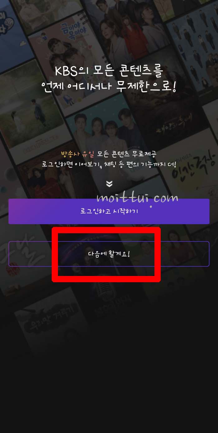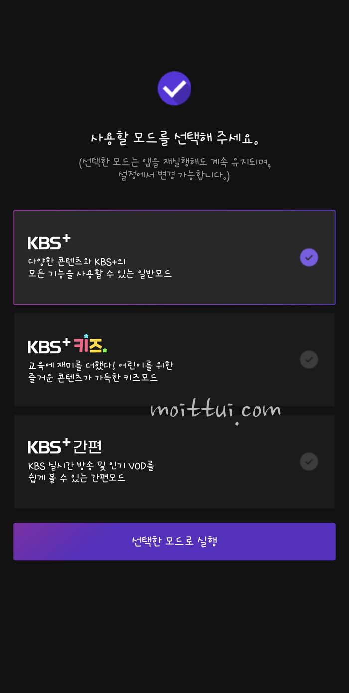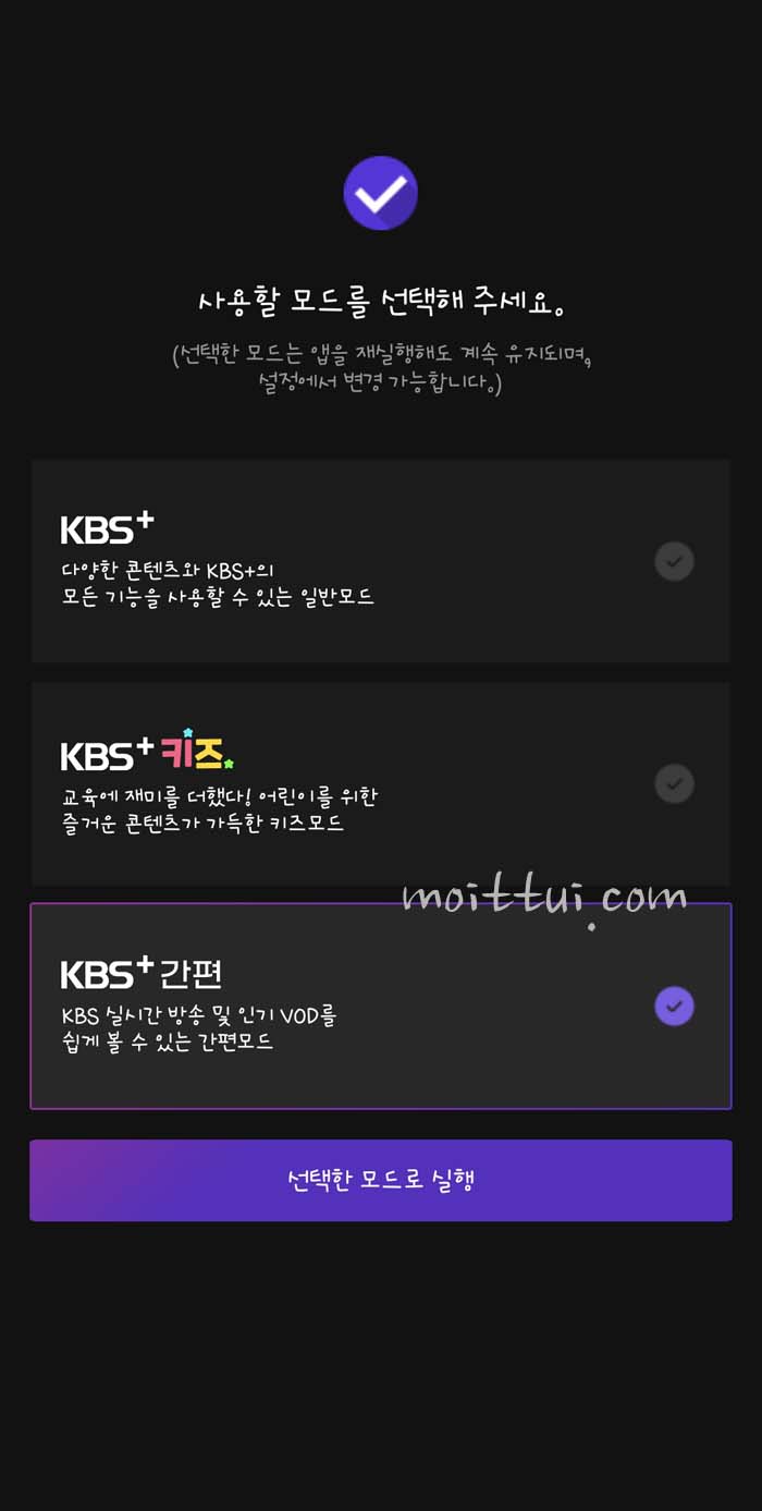그 아래에 있는 다음에 할게요! 버튼을 클릭하면 로그인 없이 실시간 TV 무료보기가 가능합니다. KBS 모바일 앱에서는 KBS / KBS키즈 / KBS간편 3가지로 사용자에 맞춰서 모드를 선택할 수 있게 되어 있습니다.