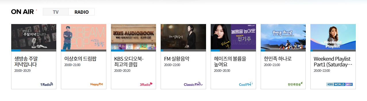 KBS 온에어에서는 현재 진행되고 있는 라디오도 보여주고 있습니다. RADIO 클릭하면 위와 같이 채널이 나오는데 채널을 클릭함과 동시에 라디오를 들을 수 있습니다.