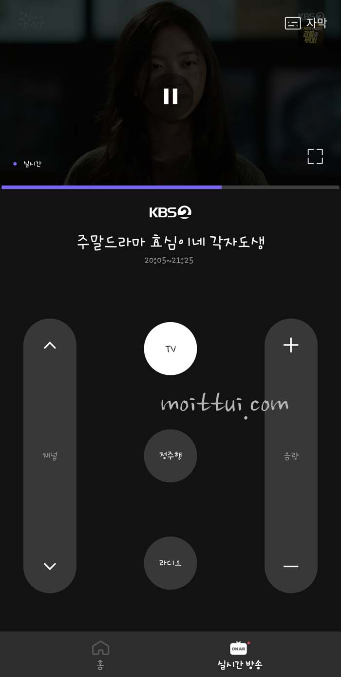 실시간TV 시청하기를 클릭하면 위 화면처럼 현재 실시간으로 방송되고 있는 화면이 나오며, 하단에는 리모컨처럼 채널과 음량 조절, 간편 세가지(실시간TV시청하기 / 24시간 정주행 채널 보기 / 실시간 라디오 방송 듣기) 를 선택할 수 있게 나옵니다.