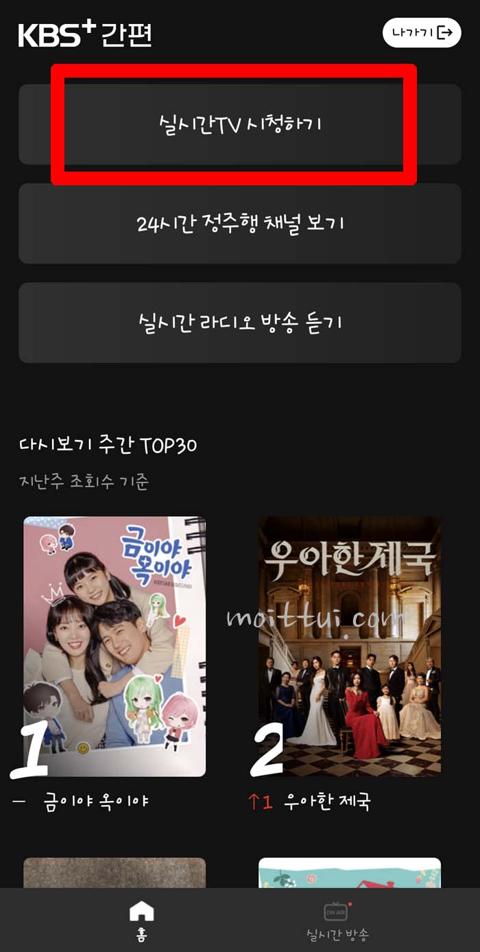 위에 있는 KBS 온에어 모바일 앱 다운로드 버튼을 통해서 설치 하면 위와 같이 메인화면이 나옵니다.