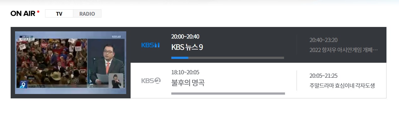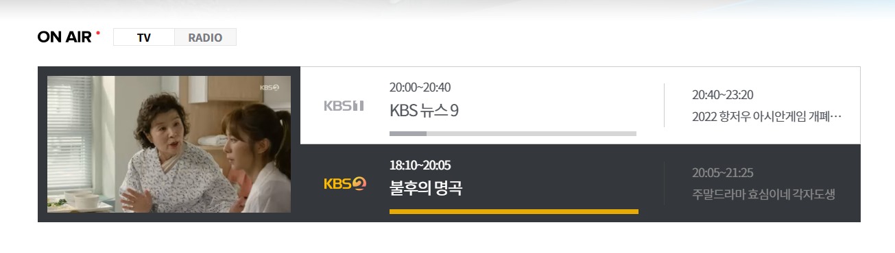 또다른 방법은 KBS 홈페이지 메인 화면 중앙에 보면 ON AIR 라고 위 화면처럼 보일텐데요 현재 실시간 TV 를 간략하게 정보를 보여주고 있습니다.
