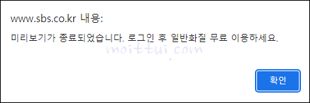 재생버튼을 누르면 광고 1~2편 시청 후 재생이 되는데요, 이건 미리보기 입니다. 3분 재생이 된 후에는 위와 같이 미리보기가 종료되었습니다. 로그인 후 일반화질 무료 이용하세요. 라는 문구와 함께 팝업창이 뜹니다.