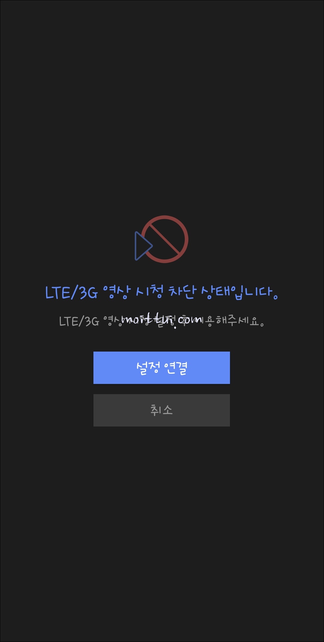 라이브를 클릭하면 LTE/3G 영상 시청 차단 상태입니다 라는 문구가 뜨는데요 당황하지 마시고 설정연결 버튼을 클릭 해줍니다.
