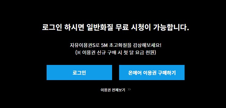 미리보기가 종료된 화면은 위와같이 로그인 하면 일반화질로 무료 시청이 가능하다는 문구와 함께 로그인, 이용권 구매하기 버튼이 나옵니다.