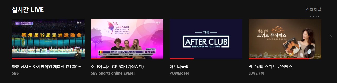 상단에 라이브를 클릭하거나 메인 홈페이지에 있는 실시간 LIVE 를 통해서 현재 방송되고 있는 프로그램을 볼 수 있습니다.