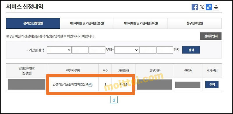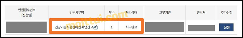 민원신청하기 클릭으로 건강기능식품판매업 폐업신고 신청이 완료 되었습니다. 여기까지 한번 읽어보고 따라했다면 3분도 채 걸리지 않습니다.