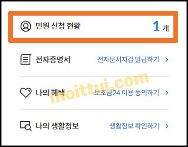 정부24 홈페이지 메인화면으로 돌아오면 오른쪽에 민원 신청 현황 1개 라고 나와있습니다. 1개가 무엇인지 확인하기 위해서 클릭 해줍니다.