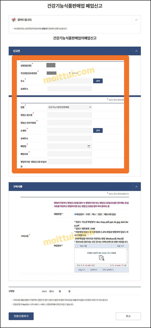 위 화면이 건강기능식품판매업 폐업신고 신청하는 화면입니다. 위에 있는 빈공란만 채우면 바로 끝납니다.