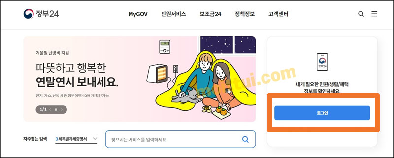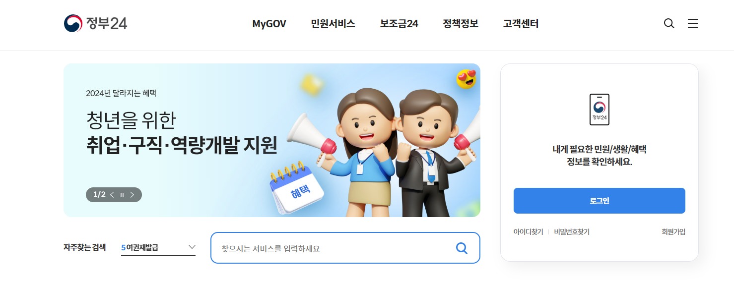 정부24 홈페이지 메인화면에서 중간쯤에 검색하는 창이 있습니다.