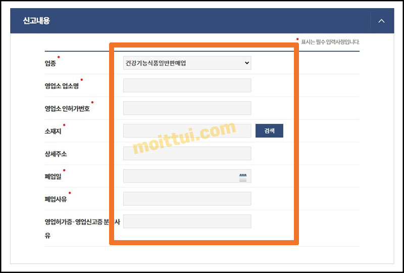업종,영업소 업소명,영업소 인허가번호,소재지,폐업일,폐업사유를 입력해주면 됩니다.