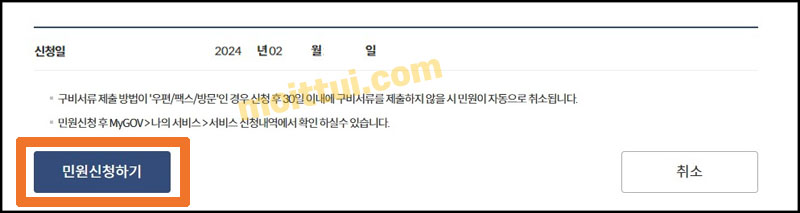 신고내용 모두 입력하고 서류제출을 했다면 현재 페이지 하단에 있는 민원신청하기를 클릭 해줍니다.