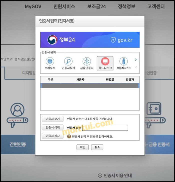 공동금융인증서 클릭 후 인증서 선택 - 인증서암호 입력을 해줍니다.