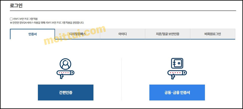 로그인은 편한방법으로 하면 됩니다. 공동인증서로 로그인 방법으로 화면을 설명 드리겠습니다.