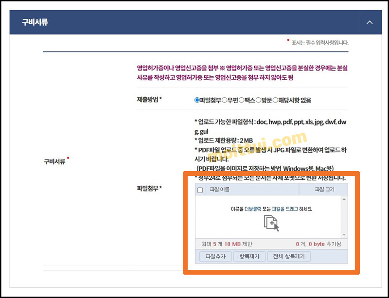 서류는 파일첨부로 가능한데, 한글파일이나 이미지 파일,PDF 파일을 첨부하면 됩니다. 단, 파일의 용량이 크면 첨부되지 않습니다. 파일의 용량이 2MB로 제한되니 용량이 크다면 용량을 줄여서 첨부하시기 바랍니다.