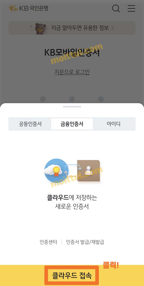금융인증서는 클라우드 접속 클릭해서 로그인을 하면 되고, 아이디, 암호를 알고 있다면 아이디로 로그인을 하면 됩니다.