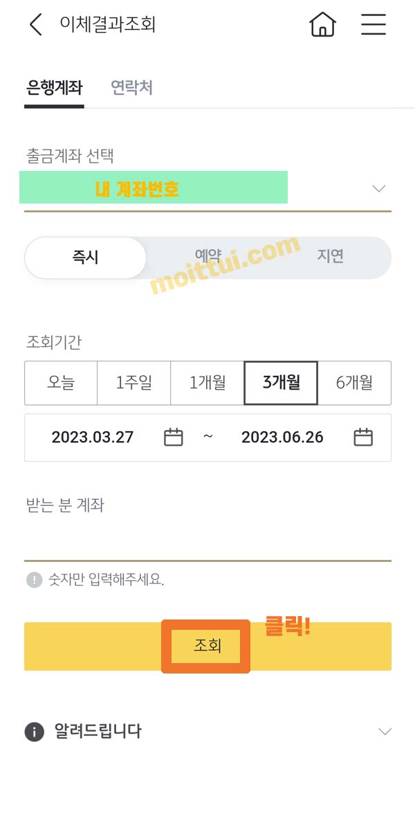 이체결과조회를 클릭하면 내가 이체한 내역을 조회할 수 있습니다.