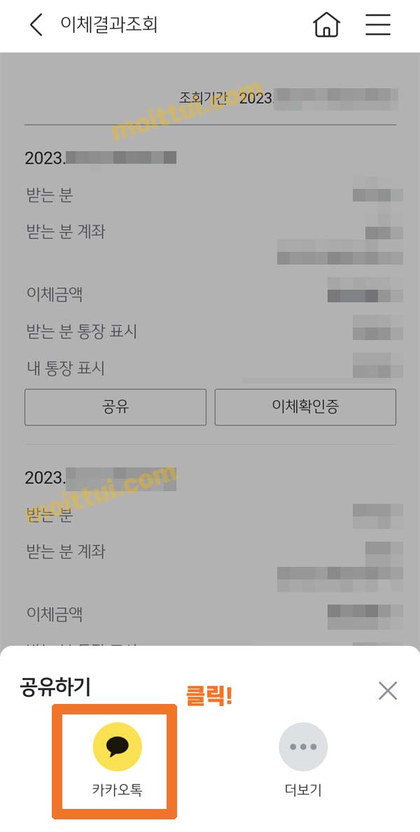 위에서 이체내역 확인을 위해서 기간을 설정하고 조회버튼을 눌렀었는데요, 조회되는 다음 화면에서 해당 이체건의 이체확인증이 아닌 공유 버튼을 클릭하면 카카오톡으로 바로 전달할 수 있습니다.
