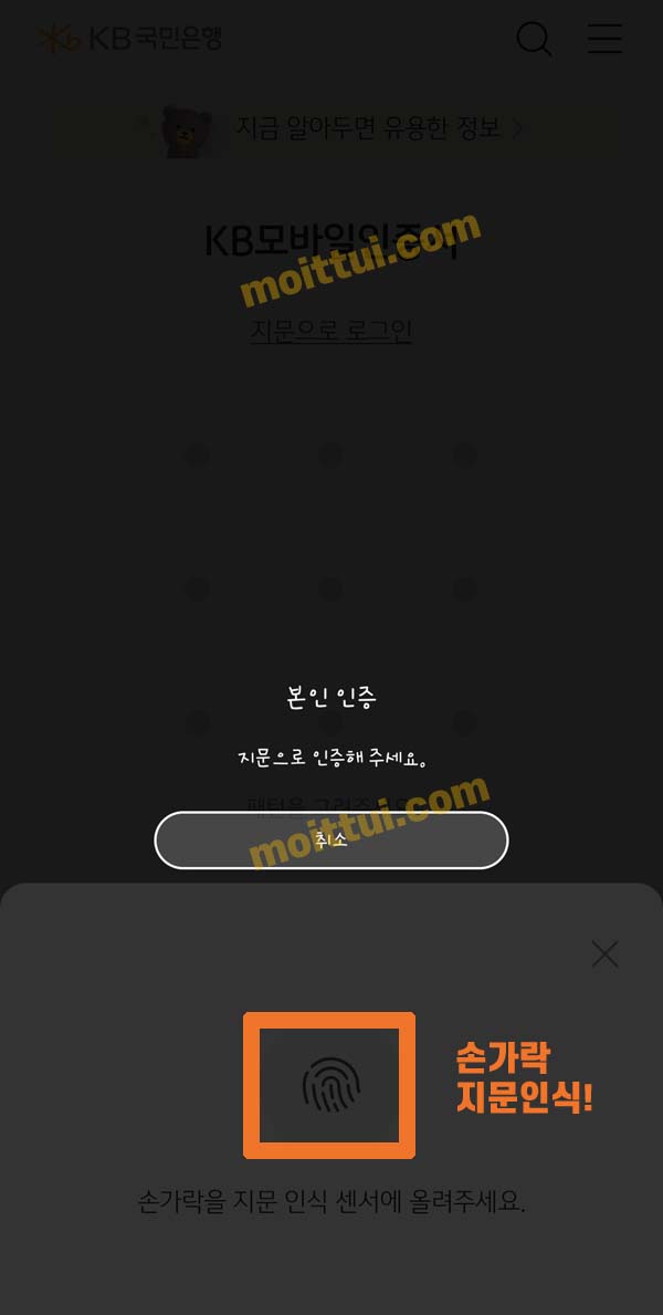 저는 KB모바일인증서 지문인식을 해놨기 때문에 지문으로 로그인을 했습니다.
