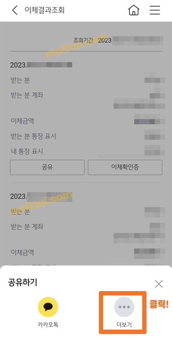 카카오톡이 아닌 문자메세지나 다른 방법으로 이체확인증을 전달하고 싶다면 오른쪽에 더보기 버튼을 클릭하면 됩니다.