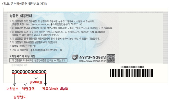 온누리상품권 유효기간은 발행일로부터 5년 입니다. 발행년도는 상품권 뒷면에서 확인할 수 있으며 아래와 같이 확인 하시면 됩니다.
