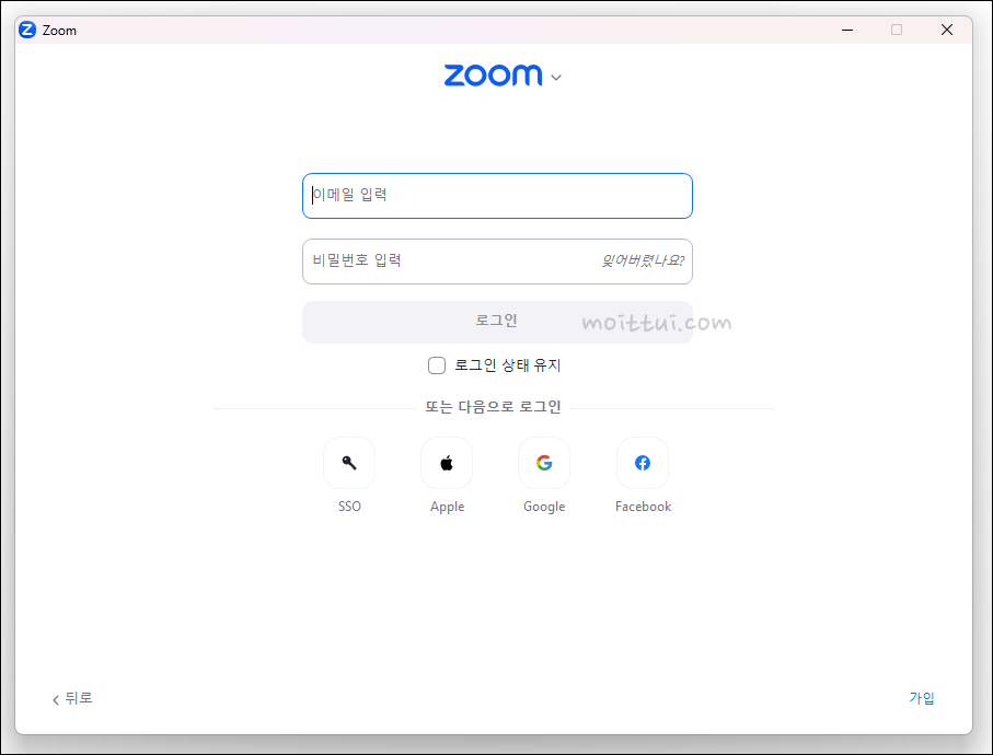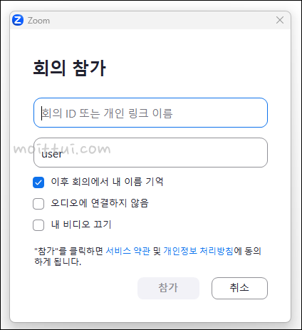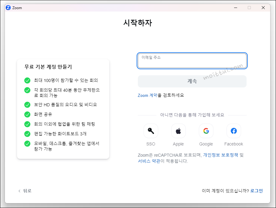 만약 회의를 직접 주최하지 않고 강의,수업이나 화상회의 링크를 받아 참여만 하는 경우라면 가입을 하지 않고도 이용이 가능합니다.
