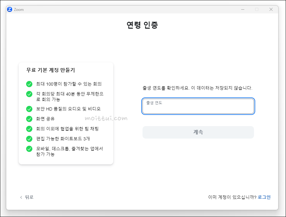회의를 직접 주최하려면 회원가입을 해야합니다. 줌 ZOOM 메인 화면에서 두번째에 있는 가입 버튼을 클릭하면 출생 연도를 입력하라고 나옵니다. 입력 후 계속 버튼을 클릭 해줍니다.