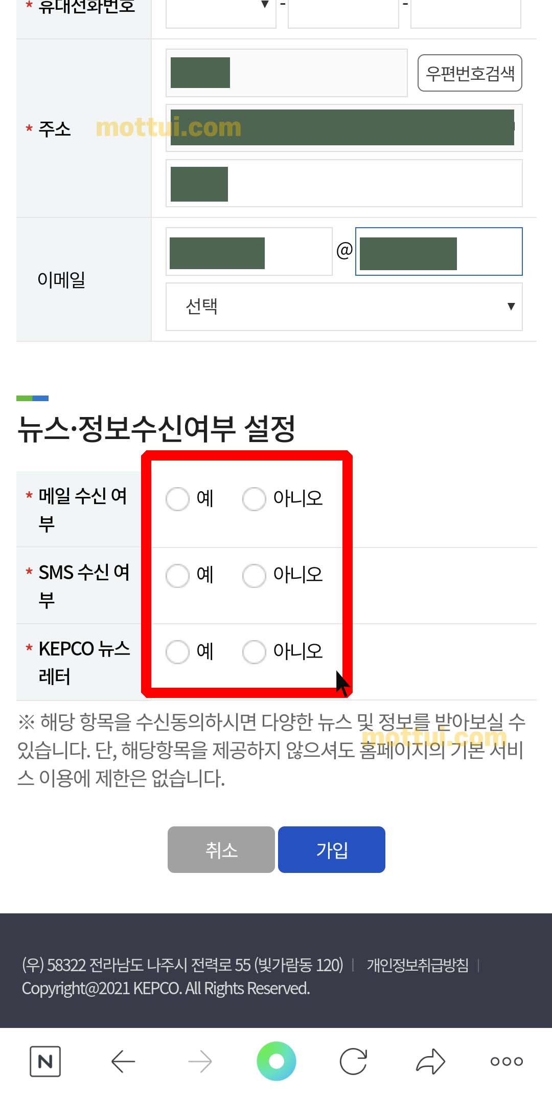 뉴스·정보수신여부 설정에서는 예 아니오를 선택 해서 체크해줘야 합니다.