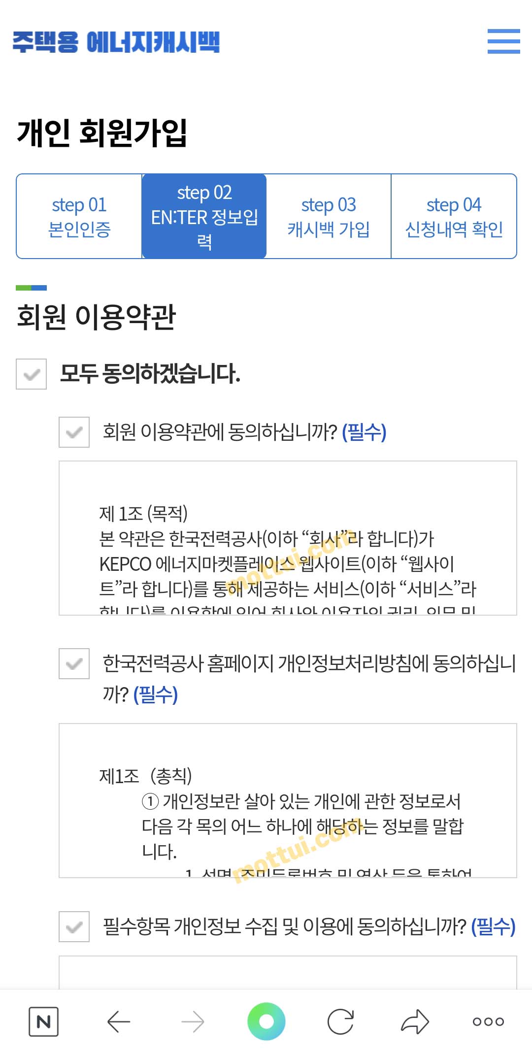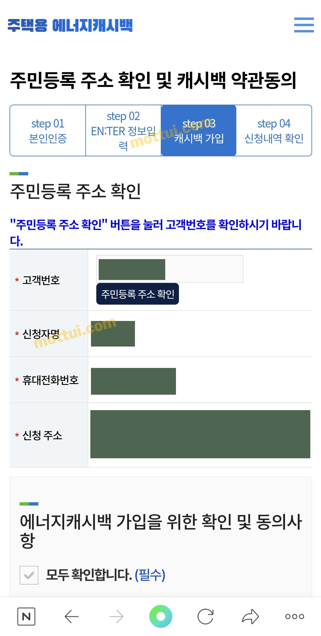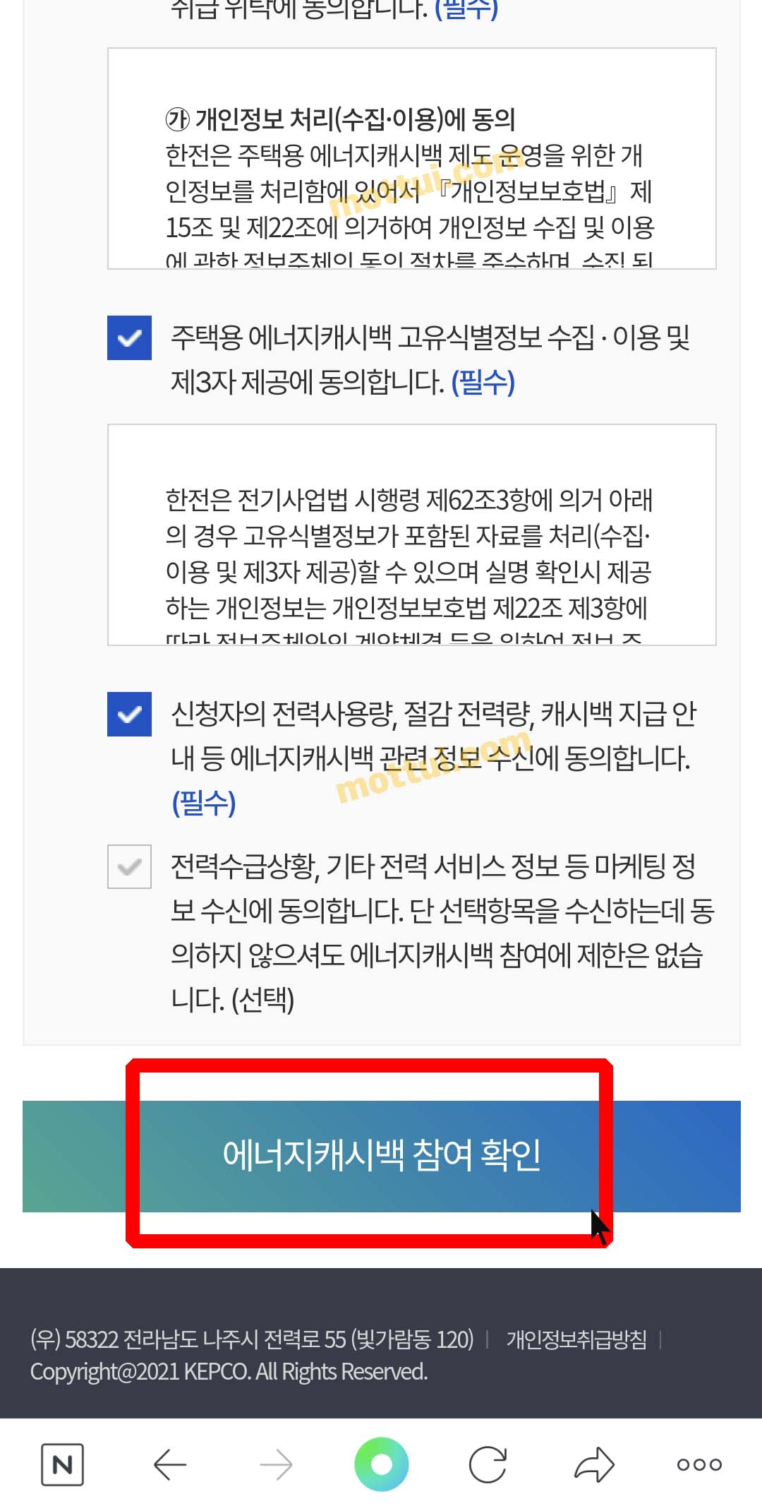 아래에 에너지캐시백 가입을 위한 확인 및 동의사항에 모두 확인합니다 클릭해 주세요. 선택사항은 해제하셔도 됩니다.