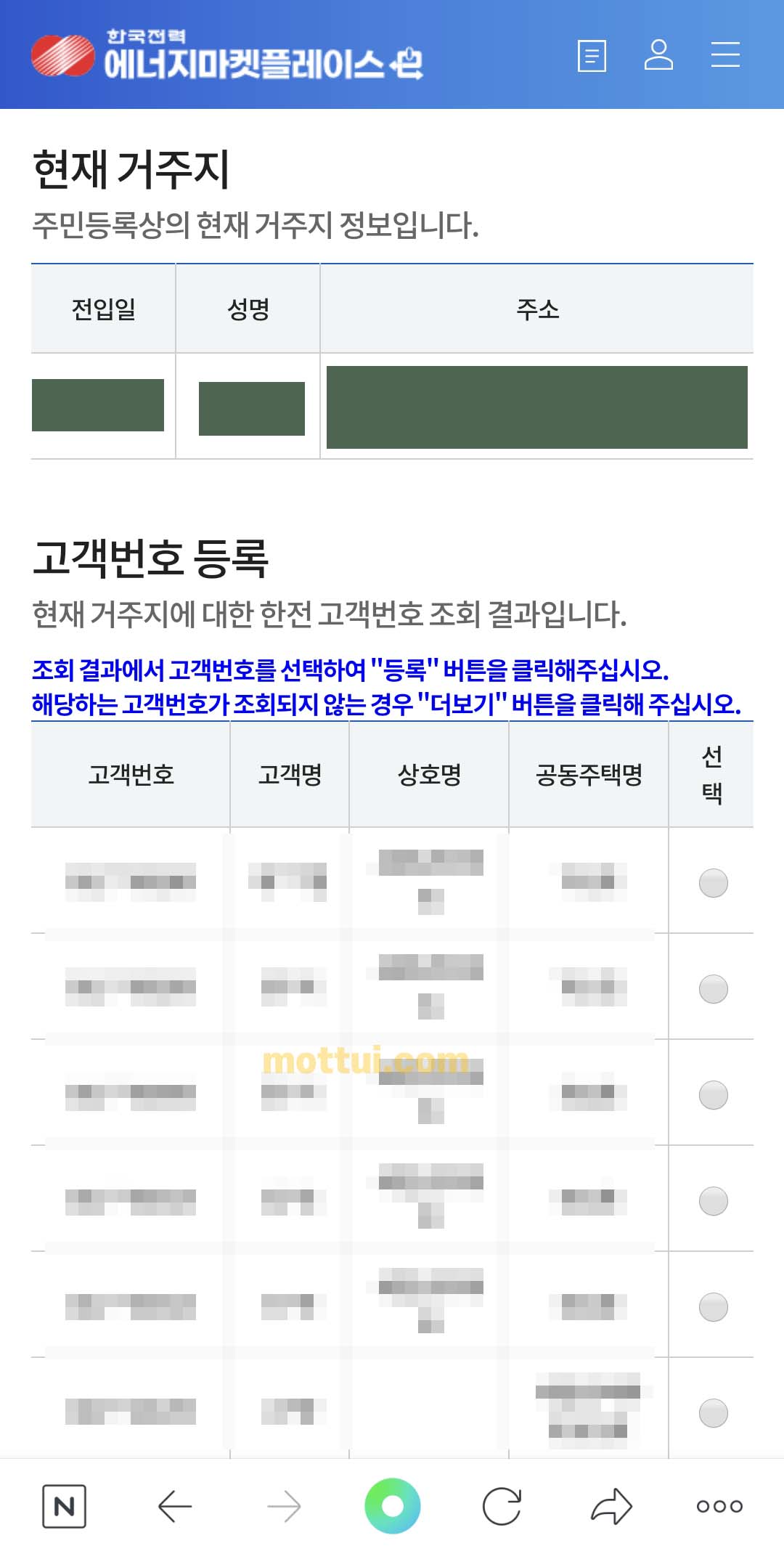 전입일, 성명, 주소가 나오고 하단에는 고객번호 등록이 나오는데 주소지가 아파트라면 호수별로 내용이 다 조회가 되는데요,