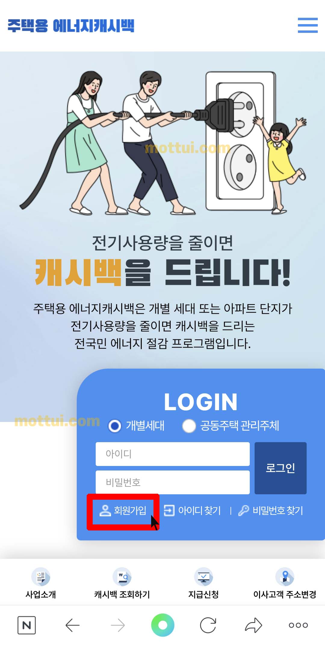 회원가입을 눌렀을 경우 다음 화면에서 개별세대 체크 확인하시고 신청하기 버튼 클릭 하시면 됩니다.