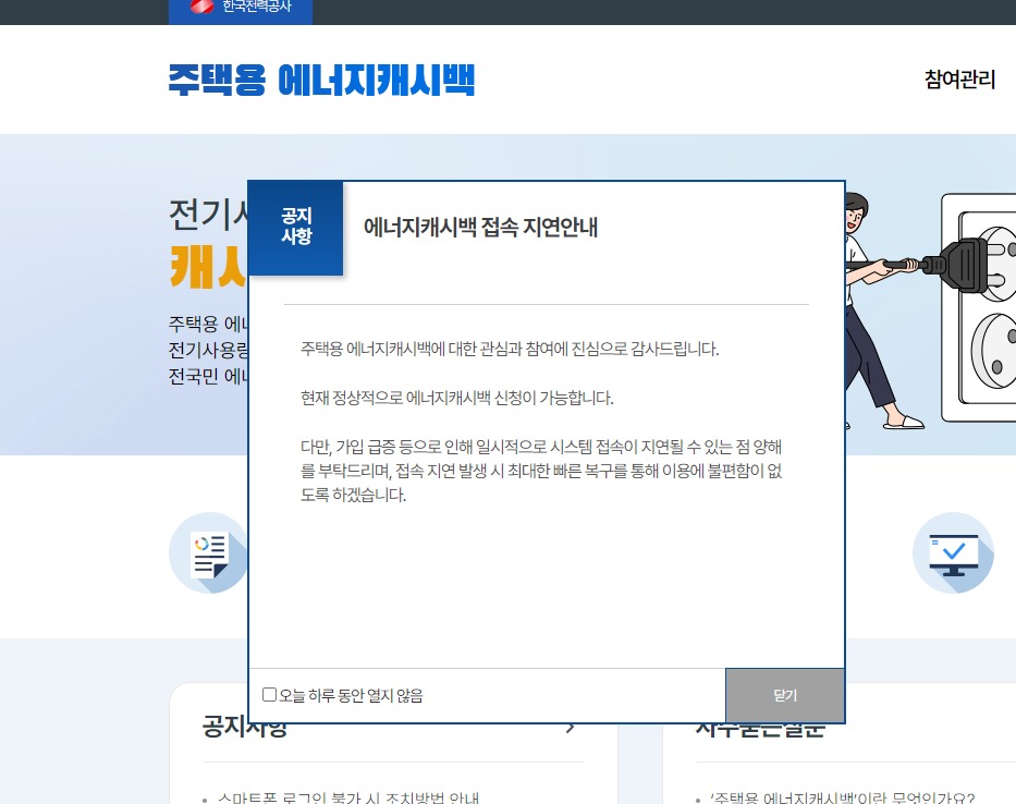 위 화면은 pc에서 접속한 메인 화면입니다. 에너지캐시백은 pc나 휴대폰으로 접속하여 신청하면 되며, 신청자가 많으면 접속이 지연될 수 있는 점 참고 하시기 바랍니다.