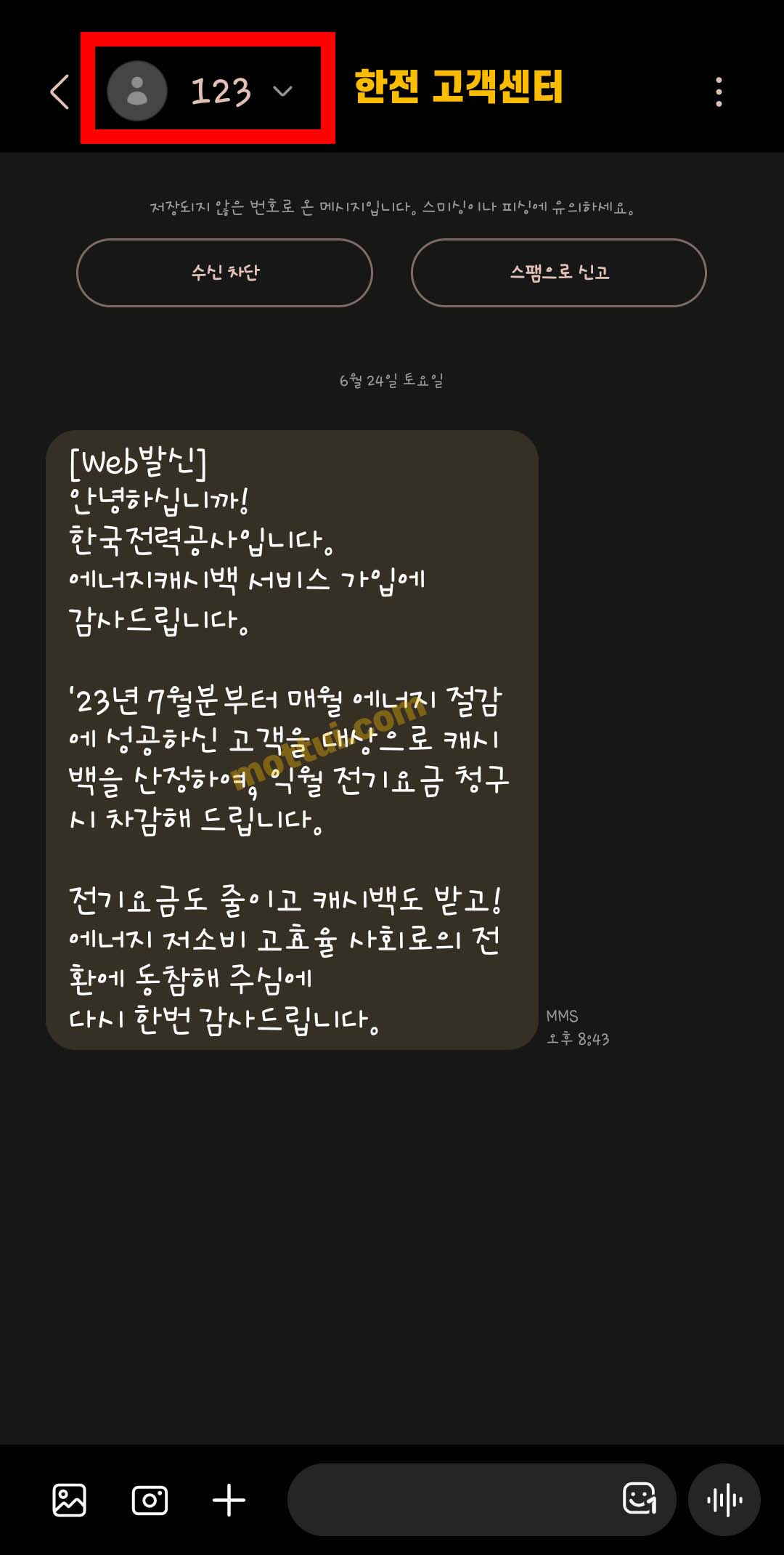 한전 에너지캐시백 신청이 완료되었다는 화면과 동시에 등록했던 휴대폰 번호로 한국전력공사로부터 문자 메세지가 바로 옵니다. 이로써 한전 에너지캐시백 신청 따라 하기가 모두 끝났습니다!