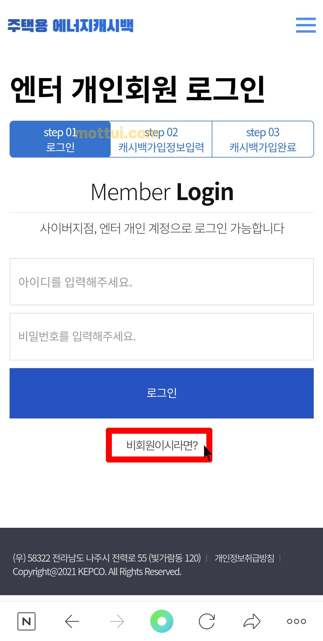 위 왼쪽 화면과 같이 엔터 개인회원 로그인 화면이 나올 텐데요, 하단에 있는 비회원이시라면? 을 클릭 해주세요.