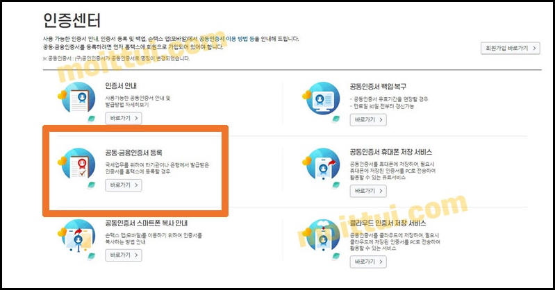 두 번째 방법은 국세청 홈택스 홈페이지 메인 화면에서 상단에 있는 인증센터를 클릭 > 공동·금융인증서 등록 바로가기를 클릭 해줍니다.