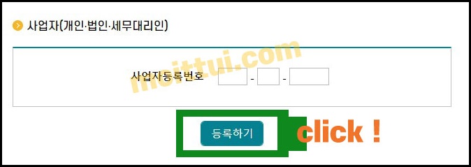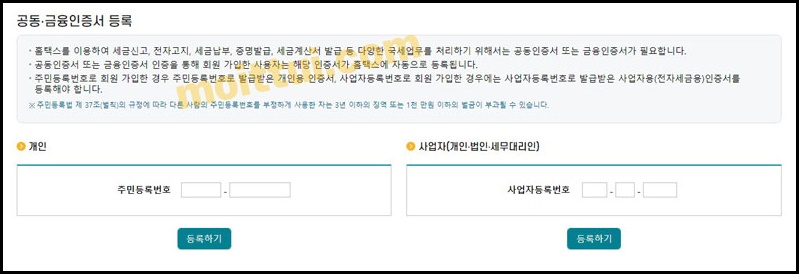 본인이 개인회원이라면 왼쪽화면에서 주민등록번호를 입력해주고, 개인사업자나 법인사업자 또는 세무대리인이라면 오른쪽에 있는 화면에서 사업자등록번호를 입력해주고 등록하기를 클릭 해줍니다.