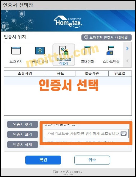 등록할 인증서를 선택하고 인증서의 비밀번호 입력후 확인 클릭 해줍니다.