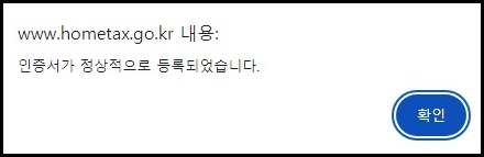 끝입니다! 인증서의 비밀번호를 입력하고 확인을 누르자마자 인증서가 정상적으로 등록되었다는 팝업창이 뜬다면 홈택스 로그인 오류 해결 되었습니다.