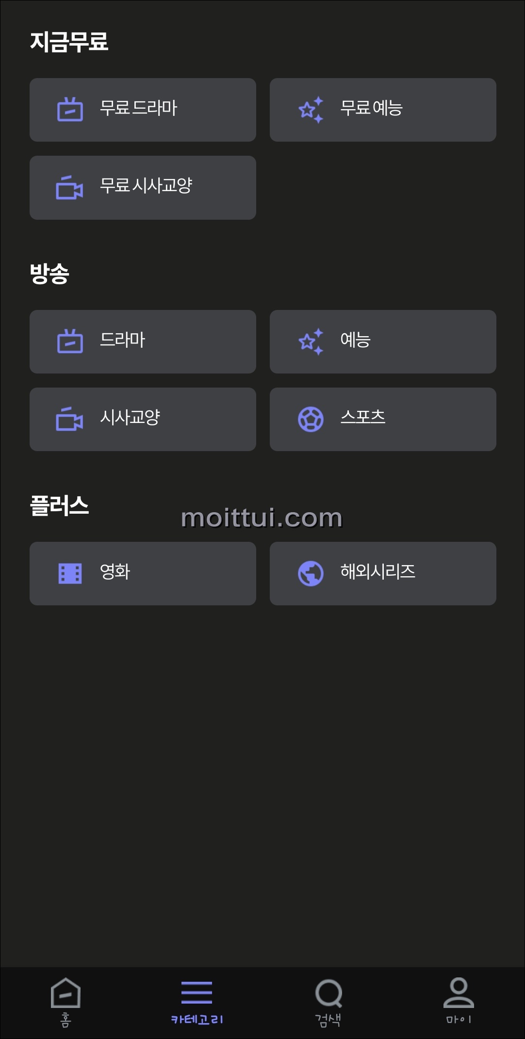 무료로 볼 수 있는 것들도 있으며 드라마, 예능, 시시, 스포츠, 영화, 해외드라마 등 다양한 것들을 시청할 수 있습니다.