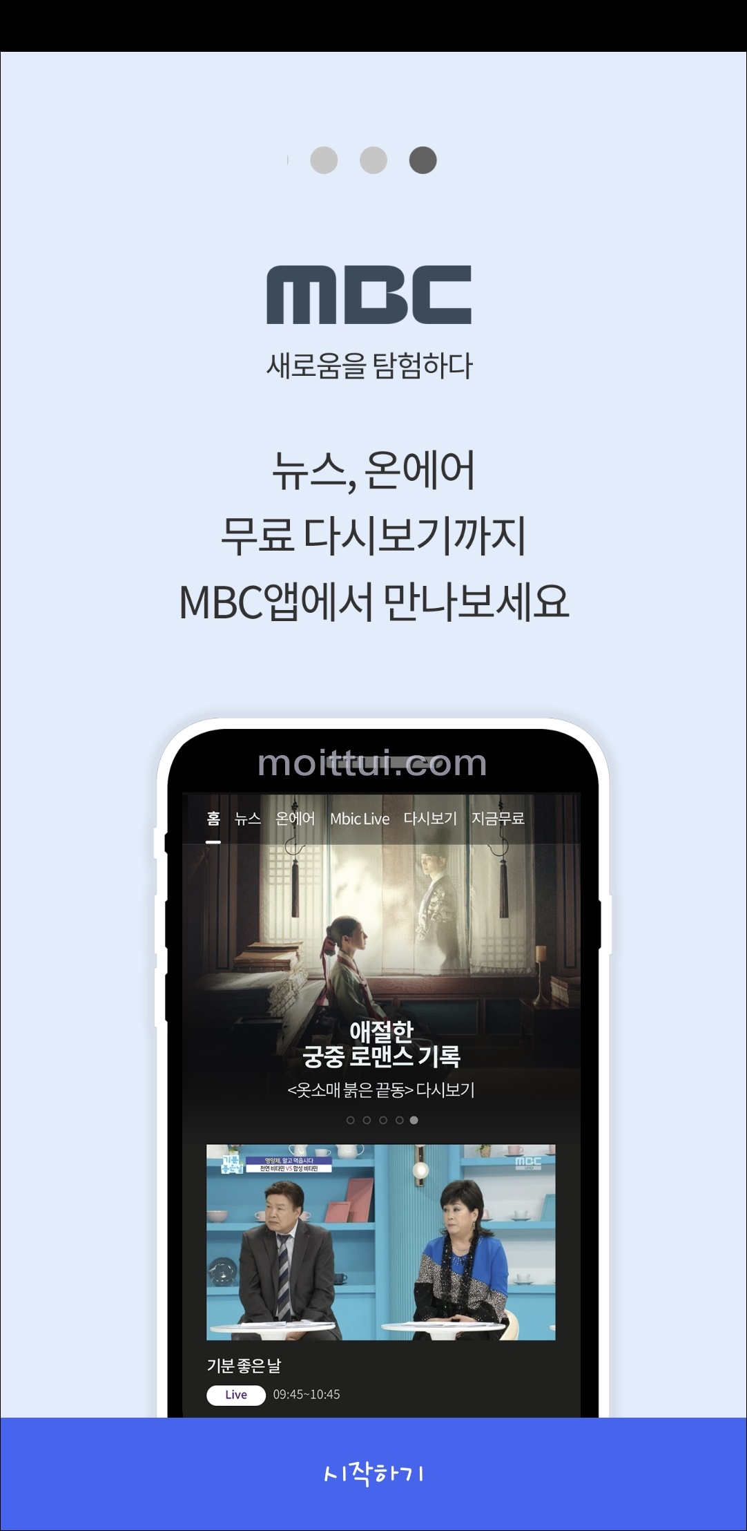 MBC라고 검색을 하거나 위에 있는 버튼을 통해서 MBC 앱을 다운로드 및 설치 해줍니다. 접근 권한 안내 확인 클릭 후 MBC 메인화면이 나오면 하단에 있는 시작하기 버튼을 클릭 해줍니다.