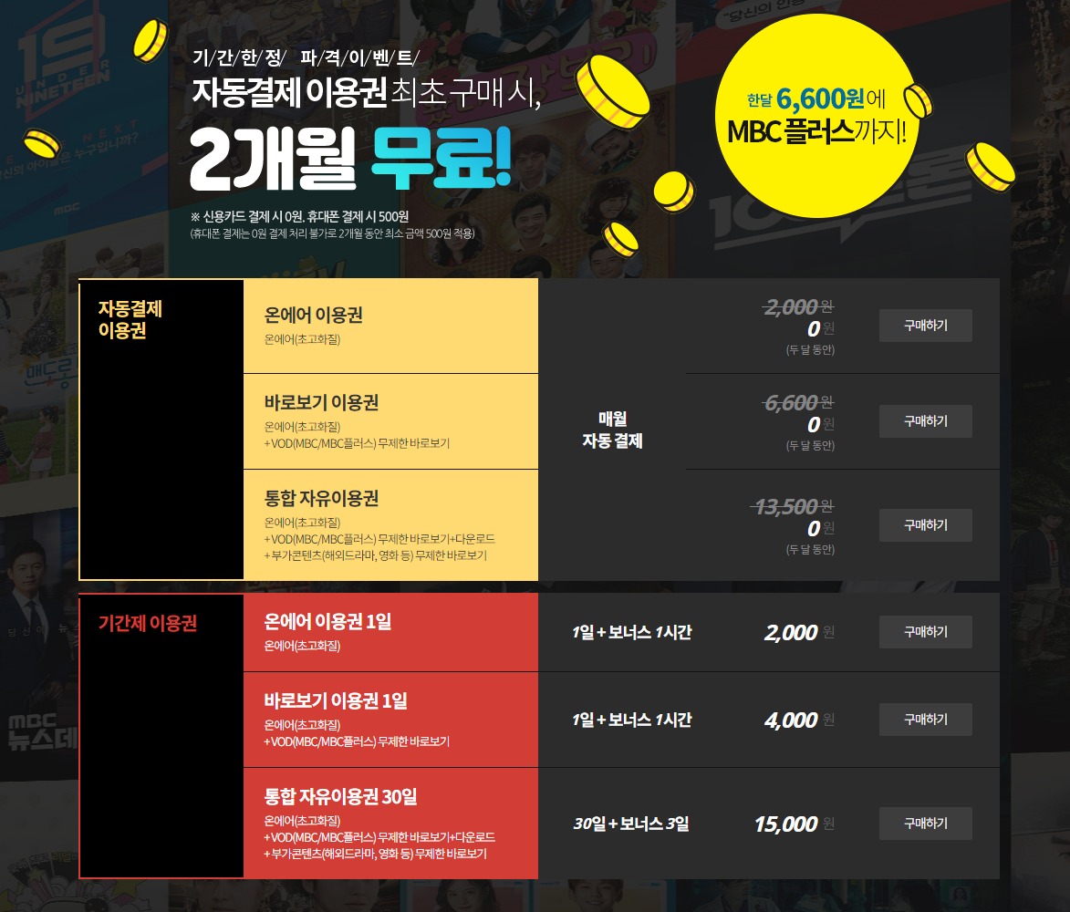 현재 MBC 온에어 이용권은 자동결제 이용권 최초 구매시 2개월 무료 이벤트를 진행하고 있습니다. 일반화질 보다는 더 선명하게 보고 싶다면 온에어 이용권을 이용해도 좋습니다.