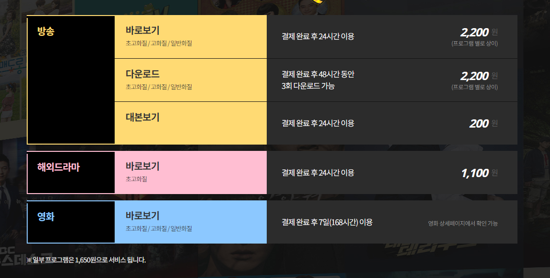 MBC 온에어는 이용권 뿐만 아니라 단건으로도 구매해서 이용이 가능합니다. 방송, 해외드라마, 영화 각 금액과 이용시간이 다르니 확인 후 이용하시기 바랍니다.