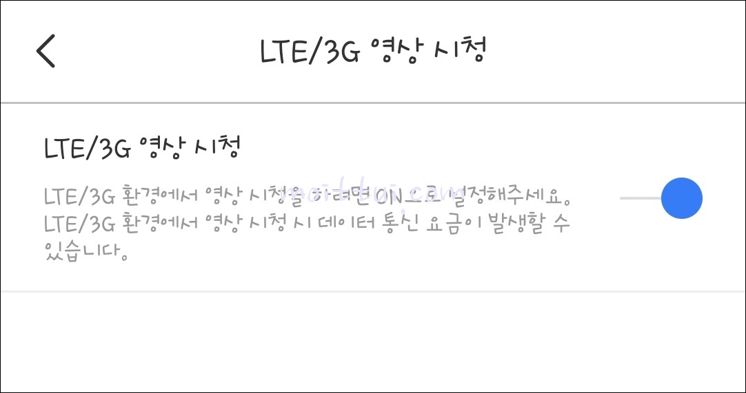 위와 같은 화면이 나옵니다. LTE/3G 영상 시청 문구와 함께 오른쪽에 동그라미 모양의 버튼이 있는데 클릭해서 활성화를 시켜주면 됩니다.